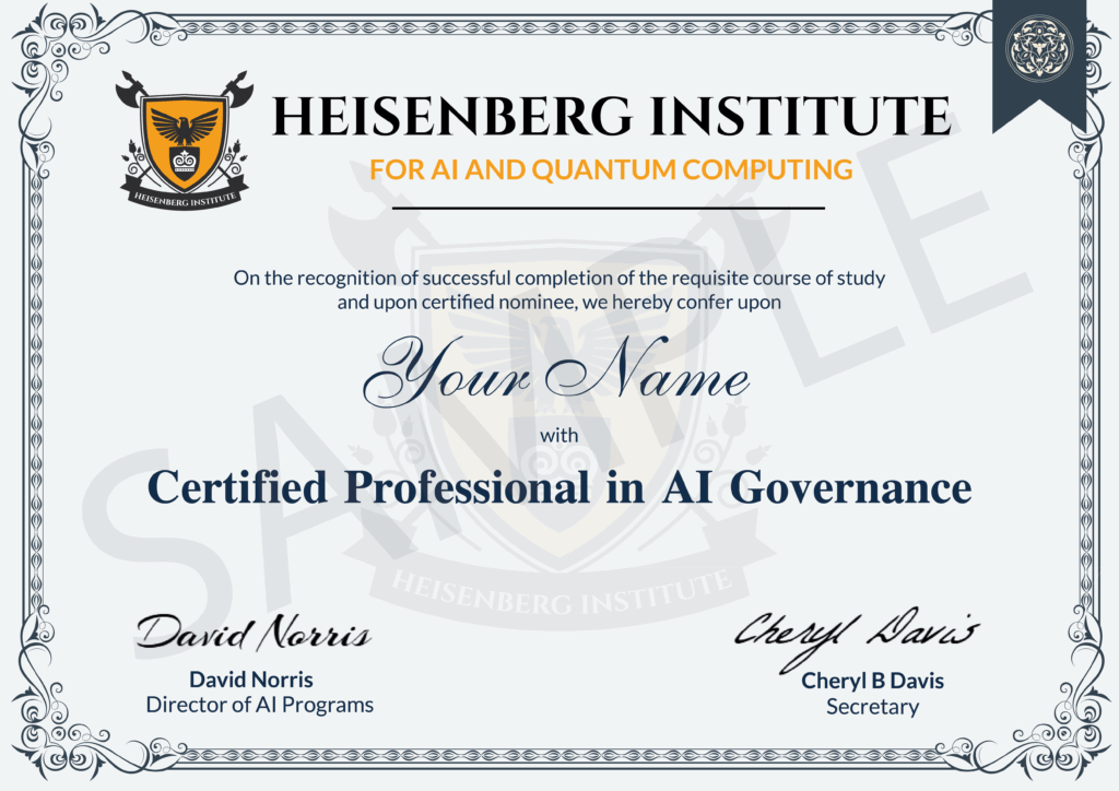 Upon successful completion of the program, participants will receive the Certified AI Governance Professional (CAIG) credential from the Heisenberg Institute for AI and Quantum Computing. This industry-recognized certification validates your expertise in AI regulatory compliance, ethical framework implementation, and operational governance across global standards.